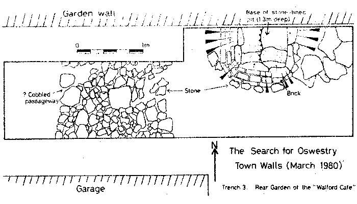 The third trench was located outside the park, in the cobbled entry to the rear garden of the 'Walford Café' (now the 'Walford Pine Shop'), Willow Street, which backed onto Welsh Walls (see comments on excavation strategy, page 25, and reported sightings, page 32). Within an area limited by the close juxtaposition of a garden wall and garage, a trench 1.2m x 5.5m was opened up (see page 38). It lay within 1m of the present footpath in Welsh Walls (SJ 28832975).